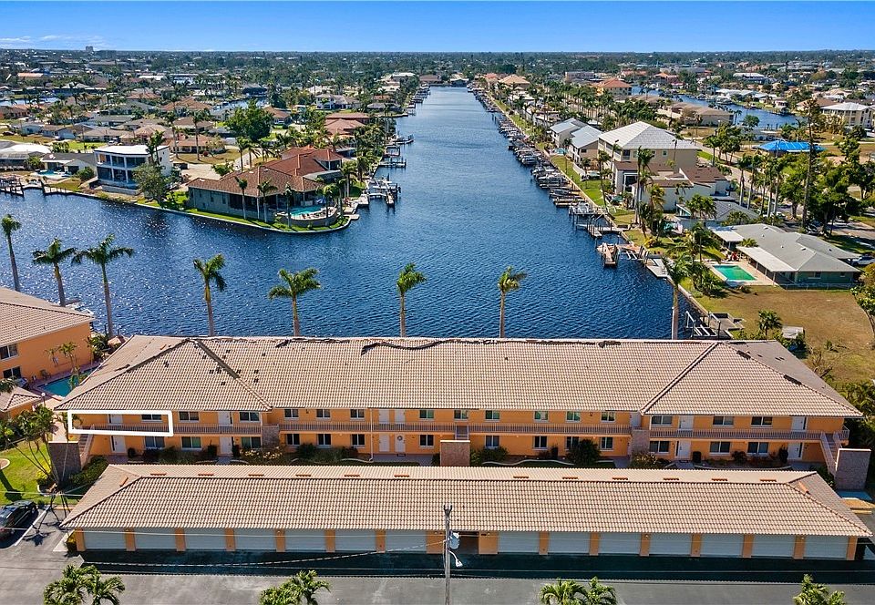 Boasting sweeping canal views just one turn away from the open waters of the Caloosahatchee River, this is a condo you'll want to see! Unit 2D is a beautiful end-unit with a 2 bed / 2 bath split floorplan featuring over 1,200 sq ft of living space, impact windows, 2022 AC, 2023 water heater, great natural lighting, a large community boat dock, and a detached single car garage. The desirable Diplomat complex is well kept and also offers a community pool to enjoy the sunsets from. The building and garage sustained some damage from Hurricane Ian. Roof is scheduled to be replaced.