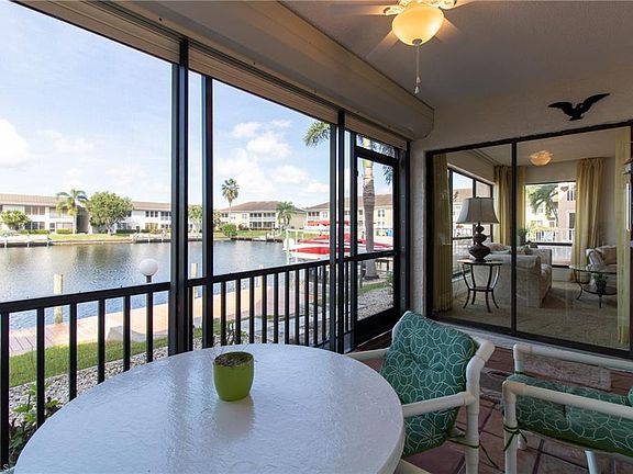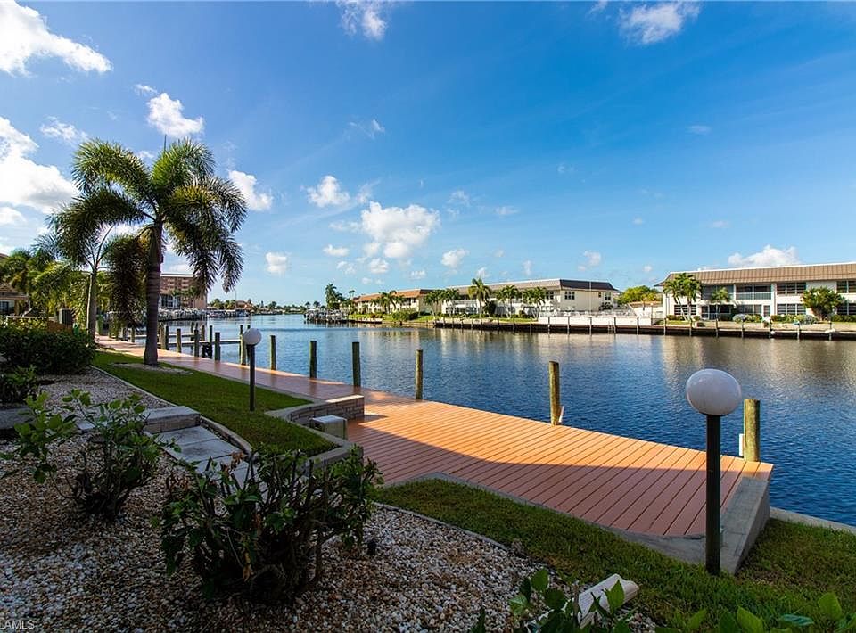 LOCATION PLUS!! This FIRST floor, CORNER,TURNKEY condo will delight you with its EXTRA WIDE, DIRECT GULF ACCESS CANAL VIEWS. This unit features a beautifully updated KITCHEN with raised panel cabinets, Cove Lighted ceiling, GRANITE counters and stainless appliances. The MASTER BATHROOM has been updated with GRANITE counters and features a separate vanity area. The Master Suite also features a large, walk-in master CLOSET with BUILT IN SHELVING and sliders to the waterside screened LANAI. Its nestled just across the street from Cape Coral's charmingly wooded JC PARK which runs along the Caloosahatchee RIVER! Boating access to the Gulf is easy since the condo is just around the corner from the River. Start your morning with a cup of coffee by the POOL or on a park bench by the River watching the sun rise then after a day of BOATING and FISHING end your day sipping a beverage on your screened LANAI while you watch spectacular Florida SUNSETS over the 200'+ CANAL. Just move in and start enjoying PARADISE!