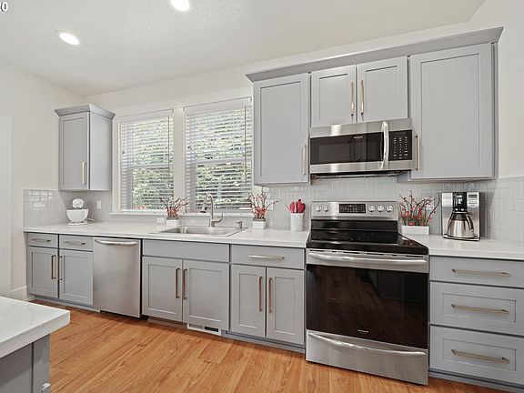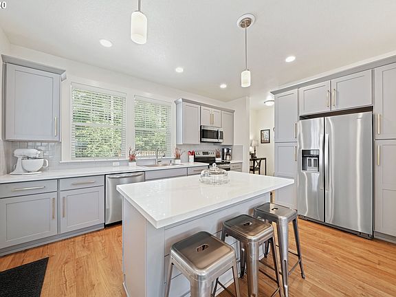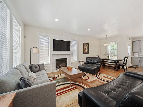 DISTINCTIVE UPSCALE yet affordable home only a year new, located in a quiet corner of the neighborhood, backing to the forested greenspace and hiking trail. Open kitchen features quartz counters contemporary custom cabinets & brushed nickle hardware. High ceiling, dressy looking greatroom with frplc. Master suite has large walk-in closet, paneled closet doors, double vanities. Private fenced backyard, porch and deck. Heat pump provides cost effective heating & summer cooling. Vac Rental licensed