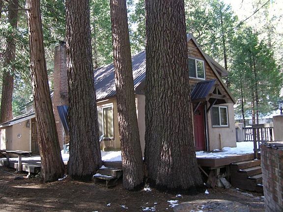 This is the perfect woodsy East Village cabin! Located conveniently close to town and the lake this 4 bedroom cabin is just large enough for family getaways and holiday gatherings. Open beam ceilings and glossy wood throughout the interior really lend to that mountain cabin feel. The living room is centered around a massive stone fireplace- just perfect to cozy up next to. The kitchen has been recently and beautifully remodeled to include such features as granite countertops, a tile backsplash, wood cabinets and flooring to extend into the dining area. Some other features are a large utility room with washer and dryer that has access from the outside. Outdoor shower on the large wood deck that surrounds cabin on 3 sides. The cabin is situated on a large, open and level lot that offers privacy and seclusion, backing So Cal Edison property. There is a woodshed for storage and a brick outdoor oven/BBQ for character. The large open lot offers plenty of room for parking