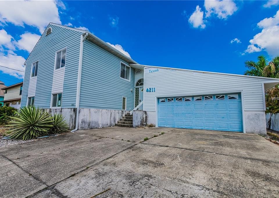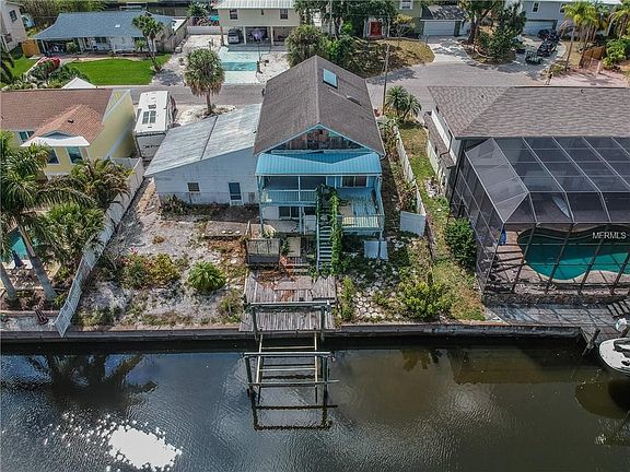Fabulous home with tons of potential on water front canal. Very unique home with two full living quarters, two kitchens, one upstairs and one downstairs. Upstairs is a large living area with a dining area, full kitchen, master bedroom, master bath, 2nd bedroom and another full bath. Downstairs is another living area, dining area, smaller complete kitchen, two bedrooms and one full bath. Both levels have access to patio areas, canal view and in ground hot tub. Large open lanai/patio area off upstairs living area that is partially covered with awesome canal views. Inside laundry, large sq footage, 2 car garage with half bath in garage. Homes sits canal front with dock and boat lift. Great view of canal, no lift to river.