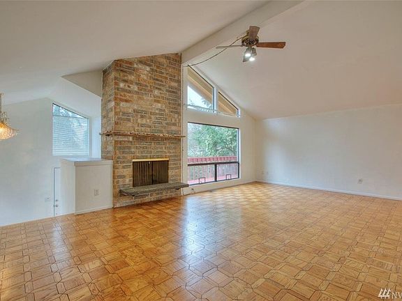 NW Contemporary in Twin Lakes! Living room w/ fireplace, big windows & vaulted ceilings. Open dining area. Kitchen w/ newer stainless appliances. Gas stove! Master bed w/ two closets,full bath and peek-a-boo view + private deck. Lower with huge living area, bedroom, bonus (possible 5th bed) and full bath. New paint throughout. Deck with access backyard. Newer furnace and H20 tank. Deep two car garage w/ extra tandem parking or workshop area. Long driveway. Community patrol and amenities.