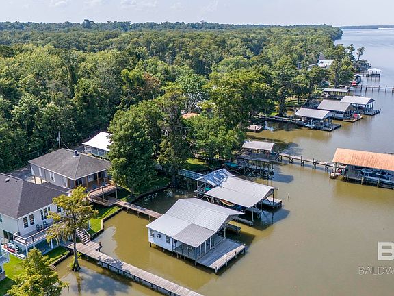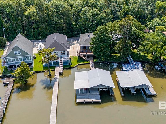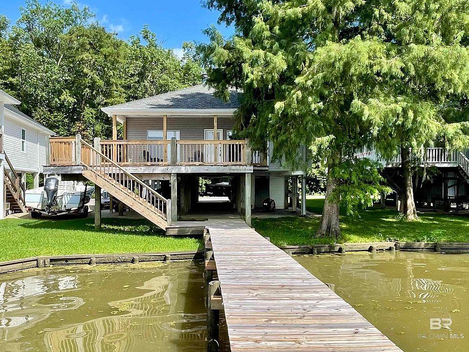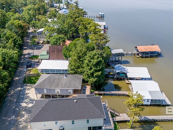 Located in the gated Tensaw Island directly on the Tensaw River, this raised 2 bedroom 2 bath cottage boasts its own private pier with boat lift (25' max boat, no t-top). Expansive front deck overlooking the river. Make this property your own permanent residence or weekend getaway retreat! House has spacious living room with wood floors and focal wood burning fireplace. Large kitchen with Kitchen Aid ice maker, dishwasher, refrigerator, electric cooktop, microwave, loads of stained wood cabinets, plenty of counter space and an oversized walk-in pantry. Overlooking the River, Primary bedroom has its own en-suite bathroom with soaking tub/shower combo, big walk-in closet. Guest bedroom and hall bathroom with shower/tub combo. Laundry room has its own heated/cooled space on front deck. Raised house allows for covered parking for up to 5 cars and a bot as well as a storage room. All information deemed reliable and accurate. Buyer to verify all information during due diligence.