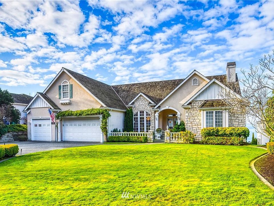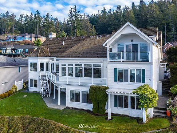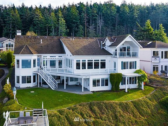 Spectacular views of Burrows Bay, San Juan Islands and Marina from almost every room! This 3 level custom luxury home includes an elevator to access all 3 levels, architectural details such as ornate columns, ceiling medallion, trim-work throughout and newly refinished hardwood floors. New ss appliances in kitchen. Master bedroom located on main floor with spa like en suite where you can relax your day away in your soaking tub w/fireplace. Enjoy entertaining, on any one of your decks.