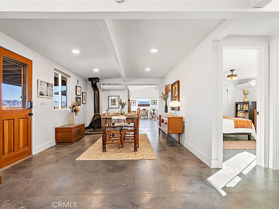 The 2-bedroom, 1-bath home features an open-concept layout with seamless flow between the living, dining, and kitchen areas. Polished concrete floors run throughout, creating a clean, modern desert aesthetic. The dining space is anchored by a statement Malm fireplace, adding warmth and architectural character. The kitchen includes a Bertazzoni induction range, blending high-end performance with modern design. Mini-split systems throughout the home provide efficient heating and cooling year-round and stacked washer and dryer.
