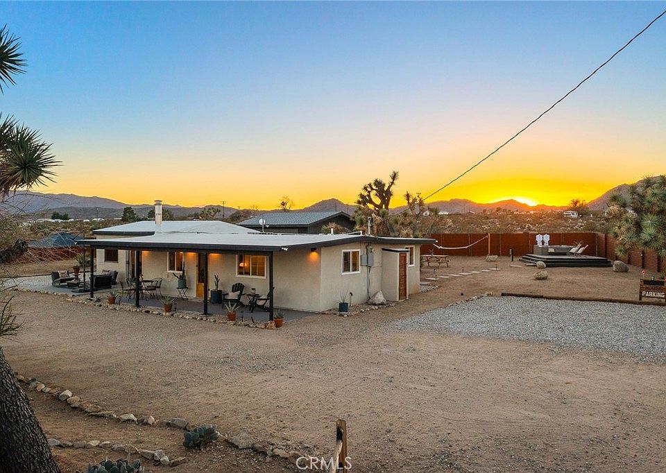 The shaded front porch offers comfortable outdoor living during the summer months. In the rear, an oversized deck with a large hot tub captures expansive 360-degree desert and National Park views. The privacy of the acreage combined with Joshua Tree’s dark skies makes this an ideal setting for stargazing, entertaining, and quiet desert living.