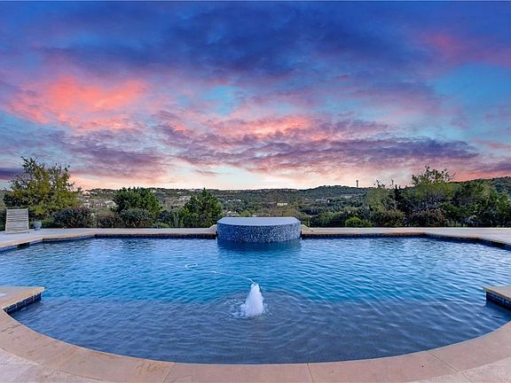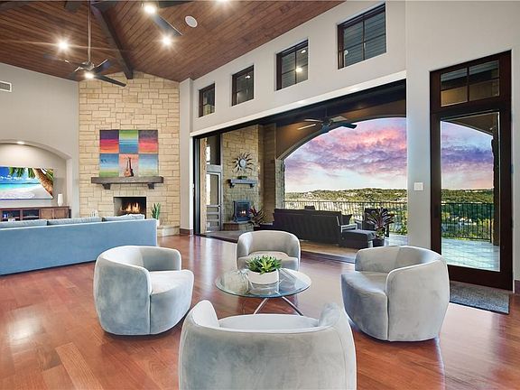 Gated 6+ acre estate perched high atop a hill, with once in a lifetime views. Sport court, bocce ball court, massive/modern design pool with oversize hot tub/tanning ledge/bubbler. Gorgeous screened/covered living spaces with fireplaces and the views that drive people to Austin. Next to the pool is an additional outdoor covered living area with kitchen. The entertaining pavilion is wired for bands or as a serving area for catered outside entertaining. 5 car garage, porte cochere, magnificent paver courtyard/motor court with fountain. From the moment you arrive you will feel the incredible quality of this build. A massive, retractable 20" wall of glass in the family room brings the outdoors in, with Mahogany floors throughout the main level. The family room also boasts a floor to ceiling stone fireplace, 2 story ceiling with wood finish, and is open to the bar/wine area, as well as the kitchen...Thermador appliances, including 2 dishwashers, massive built-in refrigerator with ice, commercial gas range with double ovens, microwave drawer, warming drawer, and ice maker. Master has mahogany floors, marble counters, a soaking tub, entry to a private screened porch with fireplace, and distant Hill Country views. Private 2 story wine cellar with a spiral staircase, Cantera doors, built-ins and dumb waiter. Game room and media are just off the pool area, and offer a full bar, which can double as a downstairs kitchen...fridge, ice, dishwasher, microwave, etc. Separation for all bedrooms/baths, perfect for kids or guests. The guest casita is complete with kitchenette, and beautiful bathroom. The office above is also just outside the main house, and offers another beautiful bathroom, and some of the best views you will ever find. Solar panels give incredibly low electric bills. Convenient to the airport, downtown, Galleria shopping, golf courses, Lake Travis, great schools, hospital, movies, and restaurants. Beautifully furnished.