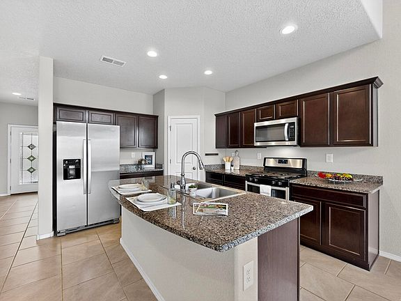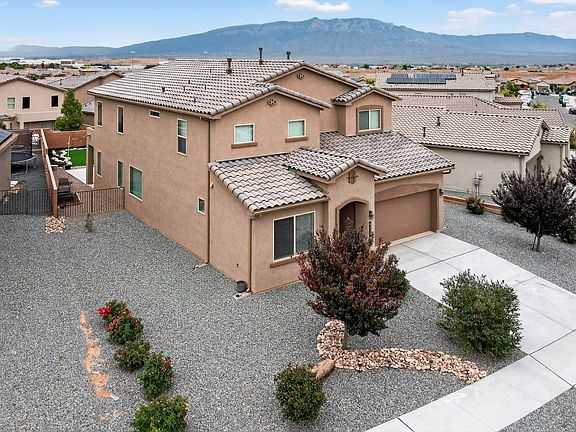 Experience elevated everyday living with stunning Sandia Mountain views & a beautifully landscaped backyard featuring an extended patio, low-maintenance newer turf, a private hot tub & evening shade. The main-level primary suite includes a walk-in shower, generous closet space, and direct access to the laundry room. A dedicated flex room is perfect for a home office or creative space. The open living area features soaring ceilings and large windows that create a bright, airy feel. At the center of the home, the sleek kitchen offers stainless steel appliances, a spacious island, and ample cabinetry. Upstairs, you'll find a large loft, a private guest suite with its own bathroom, & two additional large bedrooms. Designed for comfort & style!