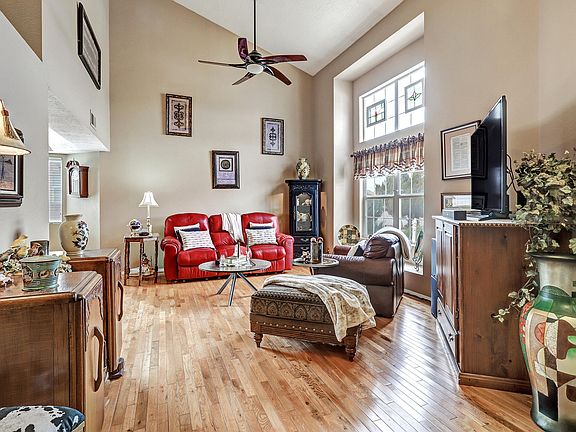 From the time you drive up this HOME will impress you! Beautifully Landscaped with flagstone walkway around, Backyard access and VIEWS! As you enter you will find GLEMING real hardwood, oak floors and a great light filled floorplan. Spacious first living area with vaulted two-story ceiling open to Dining room with cove ceiling. Cooks eat-in kitchen with SS appliances and open with bar to second living area. The owner's suite is on the main floor with full bath - Separate tub and shower and double sinks, Plus, open to covered patio. 3 more bedrooms upstairs! Furnace and refrigerated air done in 2021. OUTSTANDING Backyard with covered and open patios Plus nice garden area and 3 grape vines - 48 jars of jelly last year! Come See great HOME!