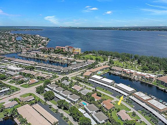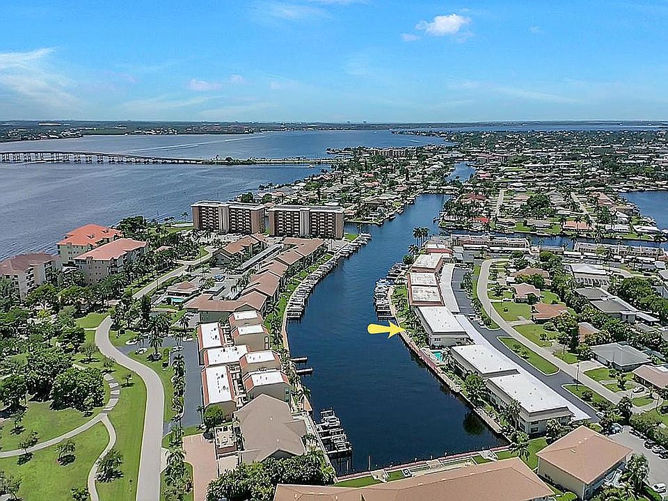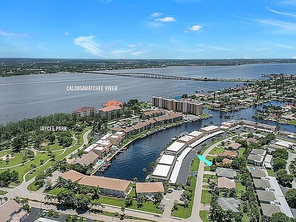 Gulf access condo in boating neighborhood! Situated on the first floor, this corner unit has been fully renovated with porcelain tile throughout, hurricane impact windows and sliders as well as roll down shutters in the lanai. Plumbing and electric have been updated as well. Kitchen was completely restructured featuring custom cabinetry, new appliances including a wine cooler, new lighting, a pantry and a built-in desk. Updated light fixtures, renovated bathrooms, a great room design w/ two full suites, and in-residence updated laundry room. You will love the water view from the Florida room. This home has one assigned covered parking area, and is just a short walk to the community pool and grill area. The condominium association just replaced the roof, carports, and parking lot. There is common dock space and plenty of space for your boat. PLUS it is right down the road from Jacyee Park. This is a 55+ community. A short boat ride will have you on the Caloosahatchee River, and in minutes you could be enjoying the gorgeous waterways of SWFL.