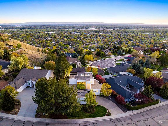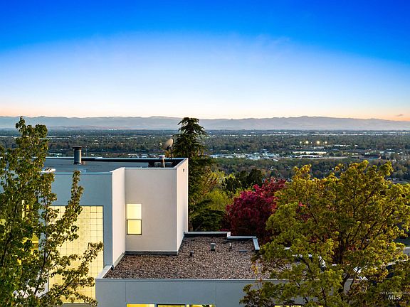 Modern architectural masterpiece in prestigious Quail Ridge with jaw-dropping panoramic views of the Boise Valley and Owyhee Mountain skyline. Soaring 17' ceilings and dramatic two-story glass flood the home with natural light enhancing the open, airy floor plan. Thoughtfully updated throughout—refinished maple hardwood, new carpet, fresh interior paint, modern LED lighting, and stylish glass block accents. The primary closest is simply huge and offers custom built-ins. The additional room off the primary wing serves as either an office or 4th bedroom. The spacious 916 SF garage boasts brand-new epoxy flooring. Step outside to new Trex-style decking, private outdoor seating, and a hot tub—perfect for entertaining or unwinding. Enjoy peace of mind and energy efficiency with a large solar panel array. Newly refinished exterior stucco adds sleek curb appeal. A private, elegant retreat just minutes from downtown, foothills trails, and top-tier schools.