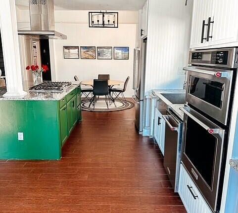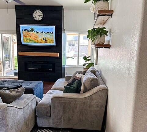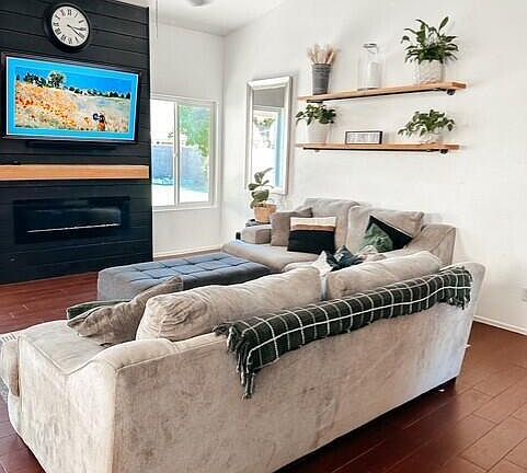 This single-family home, built in 1993, features 3 bedrooms and 2 bathrooms within its 1,503 sq ft. It's located in the Upland Hills subdivision and has a 2-car garage with additional open parking. The property sits on a 6,355 sq ft lot with gravel/stone front landscaping and a block fence, offering a private outdoor space perfect for enjoying the Arizona weather. Interior features include a mix of carpet and attractive dark ceramic wood tile flooring throughout the home. For year-round comfort, the home has central air conditioning and electric heating. The master bathroom is equipped with a full bath. The master bedroom offers a comfortable retreat with dark green accent walls. The second bedroom is a cozy nursery featuring a charming wood corner and daisy wallpaper with built in cabinets perfect for storage. The third bedroom offers a warm atmosphere with carpet flooring and a rich green wainscoting accent wall. The stylishly updated kitchen boasts dark ceramic tile wood flooring, sleek white cabinetry, and a contrasting black subway tile backsplash. A vibrant green kitchen island with a granite countertop serves as a focal point and offers additional workspace and seating. The kitchen is equipped with stainless steel appliances, including a French door refrigerator, dishwasher, built-in microwave, and oven with a stainless steel range hood. Natural light fills the space through a window above the stainless steel farmhouse sink. Open wooden shelving adds a touch of warmth and practicality. The backyard is designed for outdoor living and entertaining, featuring a turf green lawn perfect for recreation. A paved patio area offers space for outdoor dining with a table and chairs. The yard is enclosed by a block fence, ensuring privacy.