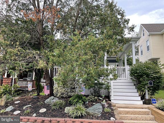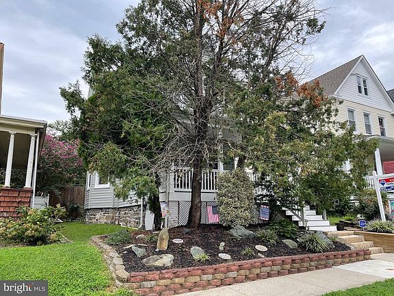Charming Colonial w/Victorian Flair welcomes you with a 7 ft deep. covered, wrap porch. Interior features a partially open, 2 story foyer w/original wood staircase, wood trim @ wall Muriel. Original wood trim & wood floors thru out. Liv Rm w/wood beamed ceiling, built in shelf & double wide, arched doorway leading to formal Dining Room w/ 2 ft bay widow. Eat in kitchen w/oak cabinets & easy access to main level Powder Room and Laundry Room. Rear kitchen Door leads to court yard style rear yard, perfect for gardens. Second floor offers space Master Bedroom w/ deep walk-in closet. 2 more bedrooms with lots of closet space and completely updated, hall bath. Second for hall has staircase leading to 2 third for bedrooms.