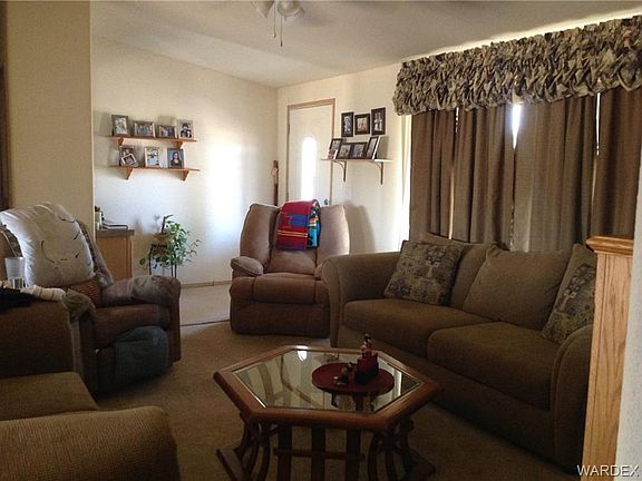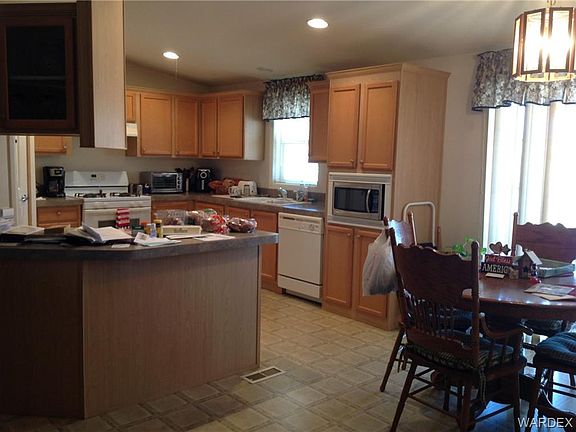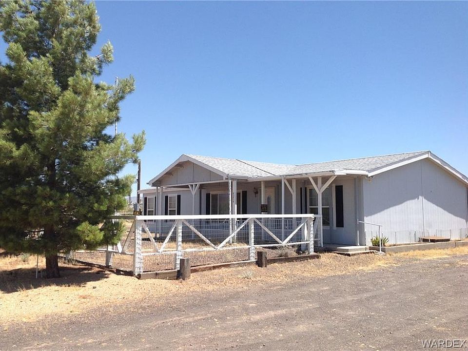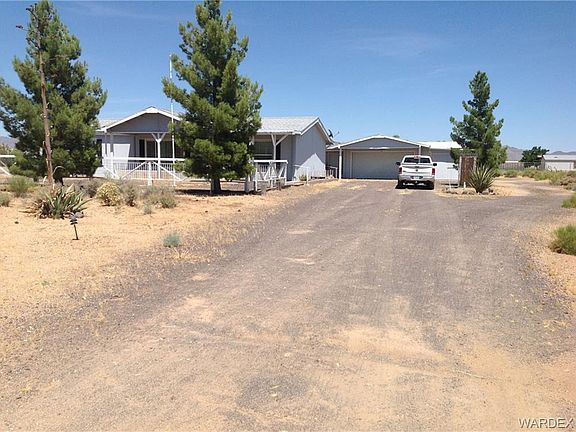 Enjoy panoramic mountain view sunrises and sunsets from the 2 patios of this really nice 2005, 3BD/2BA home. Open floor plan, with living room, dining area with patio door and kitchen with lots of counter space, breakfast bar and plenty of cabinets along with a built in pantry. Split bedroom floor plan with, Master suite and walk-in closet. Double doors leading into the spacious master bath, featuring double sink vanity, walk-in shower and additional upper and lower storage cabinets. The other 2 bedrooms are nice sized and have roomy closets. Guest bath with entry from hallway and laundry room. Washer and Dryer included! Outdoors there are covered patios on front and back of home, the driveway circles the house and garage. A detached 20x26 garage/shop with 220 service, includes built in workbenches, and a storage room in back. To the left of garage is an attached storage room, the other side is a pull through garage. 2,200 gal underground water storage tank. Full RV hook-up w/30 amp. A wash behind the home has been directed to a settling pond to the south side thus no flooding during monsoons. Home is not in a flood zone. Natural desert plants, including ocotillo, barrel, cholla, & prickly pear cactus among other trees and bushes. The lot is fenced in front with custom pipe fence, north side and back with wire fence (family member lives next door, so no fence on south side.) Front, side and back yard of the house is also fenced. Quiet neighborhood, beautiful starry nights and lots of nearby trails for horseback or off-road fun. Water sports nearby on the Colorado River, Lake Mohave or Lake Mead. Shopping and medical care are in Kingman & Bullhead City, AZ each about 25 min. away. Casino fun in Laughlin, NV only 25 min. & Las Vegas, NV is just over 100 mi away. (Furniture available outside of escrow, make offer.)