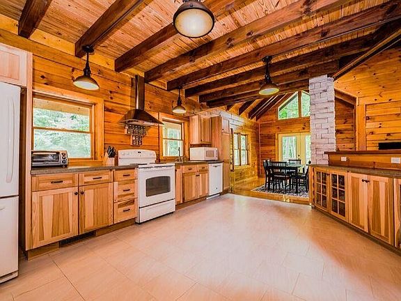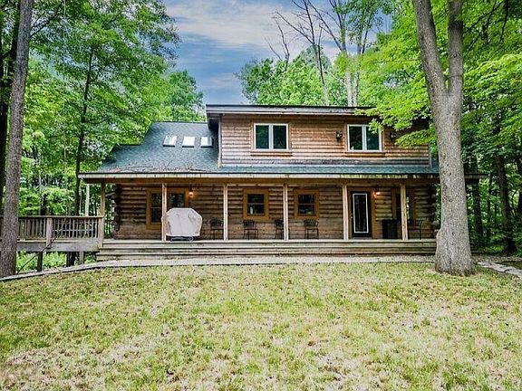 Fabulous completely renovated log home on five secluded acres featuring a half acre pond,abundant wildlife,mature woodlands and prairie that create a private retreat like no other. The home was completely rebuilt inside and out by award winning Estkowski Construction. No cost was spared to create the perfect getaway environment. Everything is new, all new electrical, wiring, plumbing, roof, eight skylights, geothermal HVAC, with a spectacular fireplace and columns that perfectly offset the natural wood of the log walls. The large bar top and fireplace mantel were made from cherry trees harvested from the property. The extensive back yard boasts a large stone fire-pit area perfect for roasting marshmallows. The sale price includes al furnishings for a truly turnkey purchase. Almost 500 square feet of screened porch wrap around two sides of he house with another large deck overlooking the pond and a covered porch across he entire back of the house. The large loft area has abundant space to relax in the treetops even with one king size and two queen size beds and features a whimsical swinging bench hanging from the beautiful wood beams. The geothermal HVAC efficiently cools the house with the summer month electrical being only about $25. Located just minutes from the cafes ,antique shops, and theaters of Three Oaks, and only about 15 minutes to New Buffalo. The house has also been a successful vacation rental property.