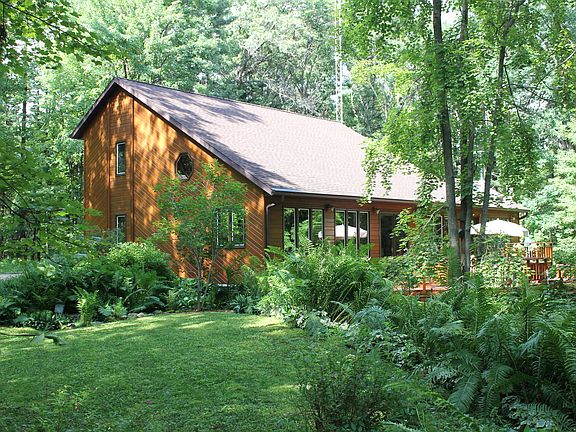 Mahogany home on 2.76 acre wooded lot. Super-insulated design features double wall construction, R40 walls & R60 ceilings, air-to-air heat exchanger, 2 story mahogany sided, 3 bedrooms, 2 full baths, M bedroom walk-in closet, attic/office, kitchen, laundry, mud room, living room, dining room, 1/2 basement finished, 2 car insulated and heated garage with cabinets & epoxy floor, 4 seasons room w/wood fireplace, in-floor heat, much more.