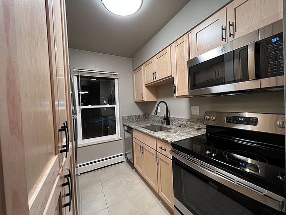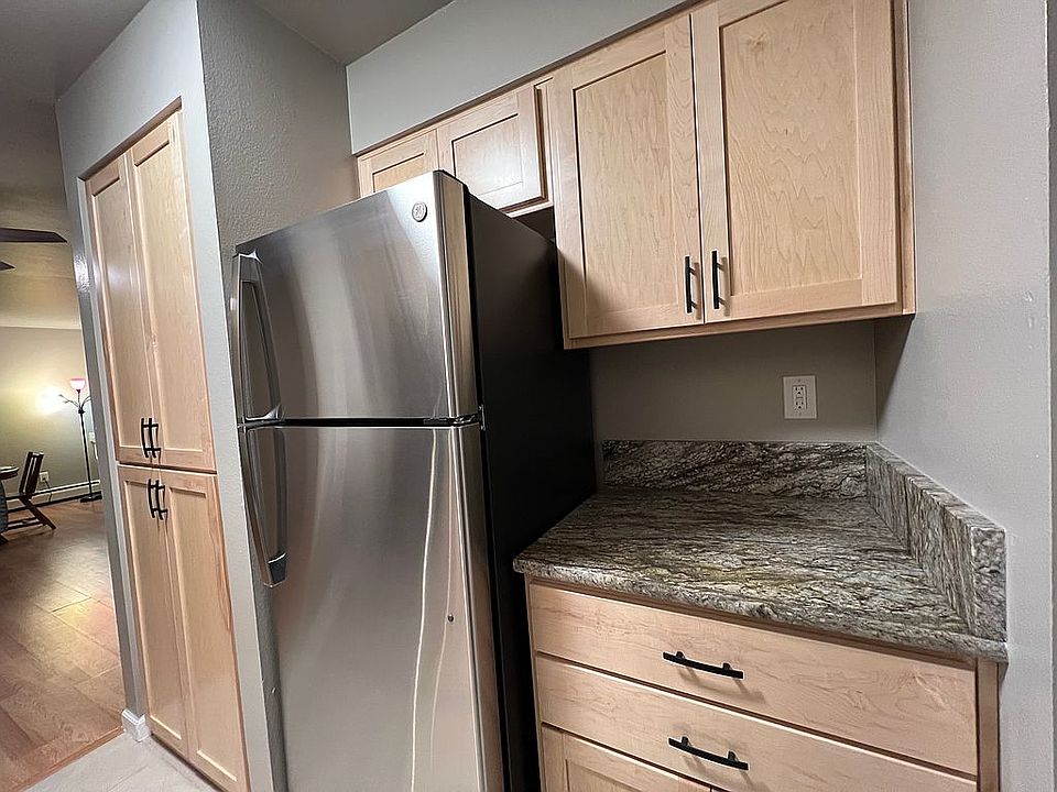 Upper level condo with two generously sized bedrooms. Master bedroom and living room walk out to the covered deck with western views where you'll find additional storage. Remodeled in 2022 with custom kitchen cabinets, new stainless appliances including new microwave, oven, dishwasher and refrigerator. New granite counters. Completely repainted with Sherwin Williams paint on walls and baseboards. New tile surround in bathroom. 2 parking tags including one reserved space in front of unit. Easy underground access to Carver Park! Community features a club house and outdoor pool. Great Location - close to just about everything! Beautiful contemporary apartment, wood laminate floors, tile floors, newer windows, all new bathroom fixtures--EVERYTHING. Air Conditioner and ceiling fans. Plus a washer/dryer combo in unit. (Updated Photos Coming Soon)