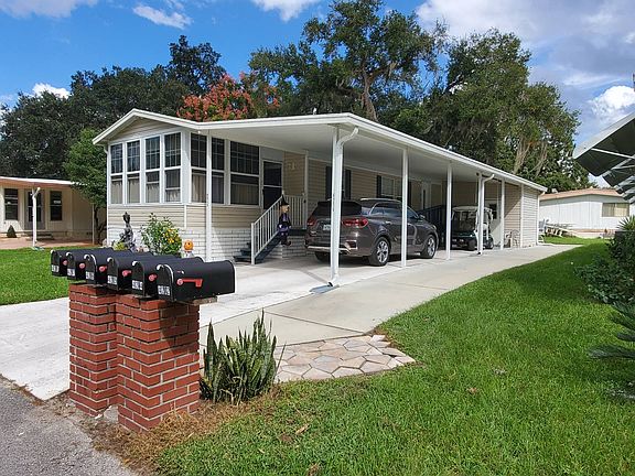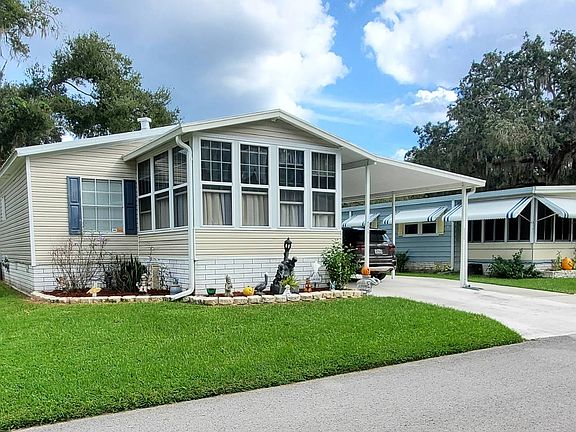 Shows like a NEW HOME! Double wide with 2 Bedroom/2 Bath, extra driveway and gorgeous details throughout. This home lives like a large brick home. Drywall ceilings and walls, French doors to office, NEW stainless steel appliances and inside laundry are a few things that set this home apart from the rest. The living room is large with open floor plan to kitchen and split bedroom floor plan. The kitchen is bright and roomy (features water filtration system) and the laundry alcove is nearby but out of the way. Large main bedroom with ensuite bath attached, both are spacious and beautiful. With the split floor plan your guest bedroom is on the other side of the home for better privacy and has its own bathroom available. Large office space could be used as dining room, craft room or anything that fits your lifestyle. A new metal roof with lifetime warranty was installed in 2019. This home is handicap accessible with ramp at entry, wider doors and hallways, etc. The front sunroom has glass windows and a portable AC unit that stays making this a year round entertaining area. This home is offered fully furnished, even dishes can remain. BONUS- the golf cart is also included!! BONUS/BONUS - ask about the option for free internet and streaming TV service available at this address! If you want all the joy of living in a new home, at less than half the price, be sure to see this one! Located north of the Tampa/Clearwater/St. Petersburg metro area, Clover Leaf Farms is a 55+ retirement mobile home community that is big on amenities. Offering two spacious clubhouses, billiards, shuffleboard courts, pickle ball and catch/release fishing you won't be bored here. There is also a dry sauna, indoor heated swimming pool, and a whirlpool-spa-hot tub as well as a large heated outdoor pool and new fitness center being built. This Brooksville, Florida mobile home neighborhood will never leave you wanting. Clover Leaf Farms also provides its residents with a pet friendly environment that includes RV storage, a scenic picnic area, and on-site management. With so much to offer, you can't go wrong when you choose to live at Clover Leaf Farms.