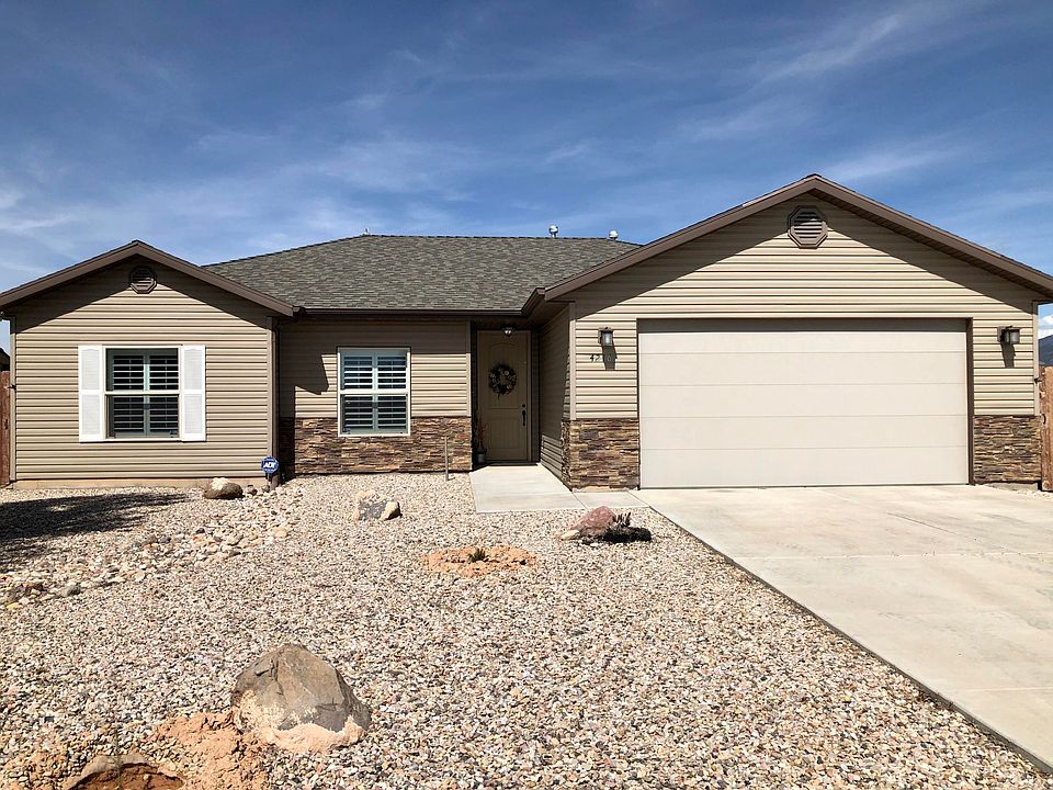 This one level home has a great location with mountain views. It sits on a 1/2 acre, fully fenced and room to park an RV. There is low maintenance rock landscaping in the front yard and grass in the backyard. This home has beautiful floors, cabinets & counter tops. The size of this lot is great if you like a little space between properties. Some features of this home are vaulted ceilings, open concept living area, granite counter tops & wood plantation shutters! Refrigerator included too!