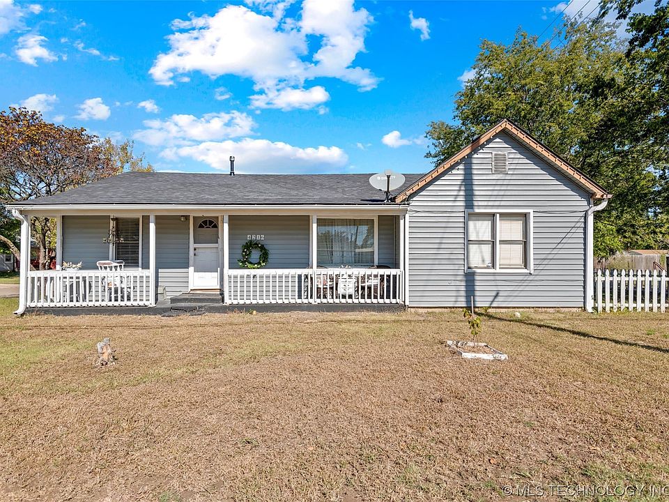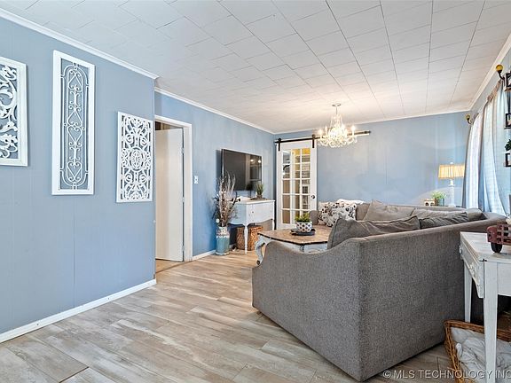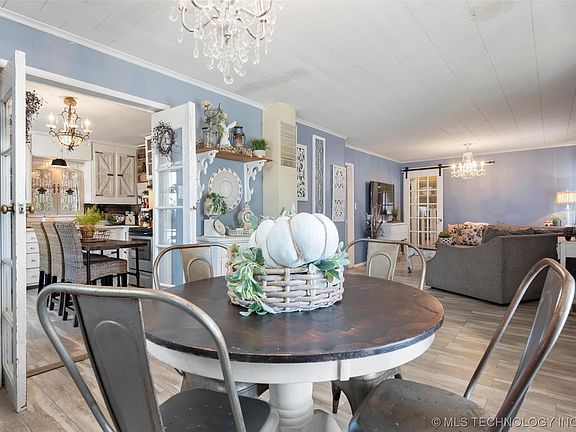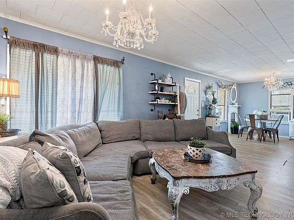 Super adorable 3 bd, 1 bath home listed at appraised value! This home was remodeled in a more up to date country style. The seller wanted a fresh look for this home but still wanted it to be practical. They left the original hardwood floor under the pretty gray laminated floors. The kitchen is a country style kitchen with plenty of cabinets. The kitchen appliances stay! The living area is nice and presently has lots of furniture in it along with a dining table but still has lots of room!. When you visit the home, imagine your furniture in it! The master bedroom has an electric fireplace and room for a king size bed. There is a shop right out the back door of the kitchen that could be used for many things including a mother -in-law home. This shop used to be a beauty shop. It has a bathroom in it. The laundry room is in the shop to this day! Roof was installed in 2019 on the main house and the other two buildings. Detached garage is nice. This home is like a home in the country. Imagine sitting on the front porch drinking coffee and reading your morning paper. Quiet neighborhood, close to schools and not far from Hwy 75 for easy commuting to Bartlesville or Dewey.