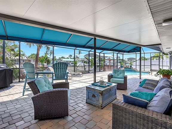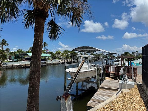 Boat Dock, 10,000 boat lift, swimming pool, Updated Kitchen, Over-sized yard in San Remo Shores Boating community with no bridges to the Gulf. Did not flood! Discover the essence of Florida living in this stunning Canal Front swimming pool home. Step inside to an exquisite custom chef's kitchen featuring a large island, abundant workspace, all custom cabinets, quartz countertops, and newer appliances—including a cooktop with hood vent. The residence offers 3 spacious bedrooms and 3 full bathrooms, along with a generous bonus room complete with its own mini split air conditioner—ideal for a home theatre, personal yoga studio, or versatile workspace. Outside, enjoy boating from your backyard oasis, saltwater canal complete with a 10,000 lb boat lift and dock, where depths of 5–8 feet accommodate your aquatic adventures. Relax by the beautiful swimming pool with its enchanting waterfall overlooking the canal, or entertain guests on the expansive screened lanai with its large covered entertaining area. Additional highlights include a New Air Conditioner in 2025, newer roof installed in 2020, solar panels Owned and paid in full, from 2021 that help keep electric bills low, and a large, oversized corner lot with extra parking and a circle paver driveway. With stunning sunsets, great boating water, and close proximity to beaches and restaurants, this home truly embodies the ultimate Florida lifestyle—with the option of an HOA for added convenience. No damage from the recent storms.