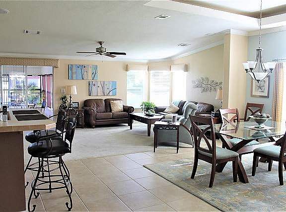 2 BR 2 BA with Den, 2100 SQ FT, Furnished, professionally decorated. Large open concept, cathedral ceilings, huge kitchen with pantry, extra large golf cart shed, double garage. Windowed Florida Room, Large Master bedroom and master suite, Newer Roof, Newer AC, Golf Cart Included.