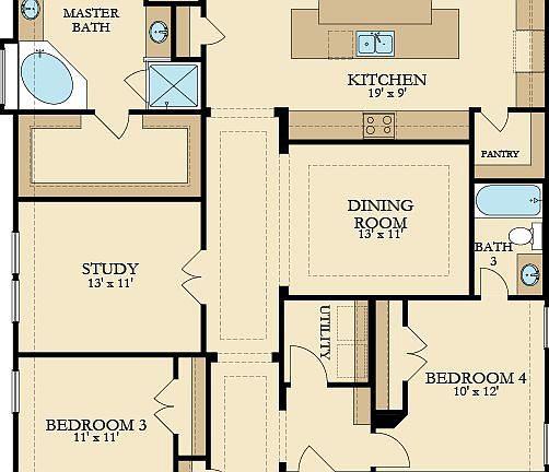 The beautiful single story Dover floor plan by Village Builders features a lovely entrance foyer, a formal dining room, kitchen with breakfast area, a generous family room with the option to add a corner fireplace and convenient access to a covered rear patio. The master bedroom features an en suite bathroom with dual sinks, separate tub and shower, private toilet enclosure and a spacious walk-in master closet. The Dover floor plan also features a walk-in utility room, and includes the option to add an extended covered patio.