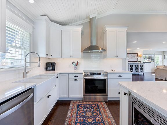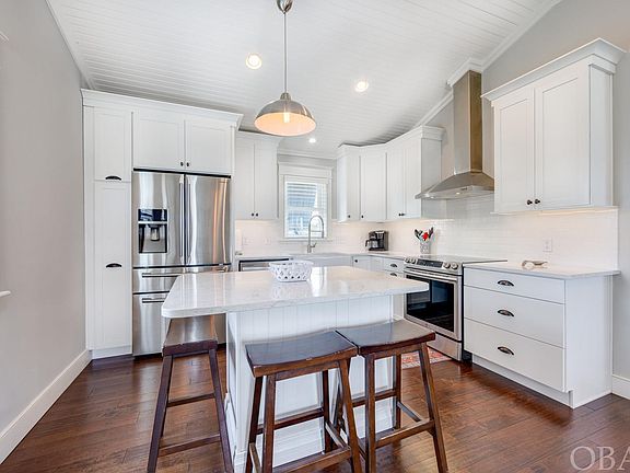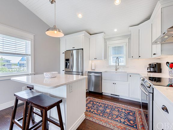 Phenomenal style and quality merge in this 3-bedroom, 3-bath oceanside haven. This cottage perfectly combines the best of Outer Banks charm with a modern coastal retreat. The exterior features sophisticated cedar shake siding and white PVC wainscoting, beautifully contrasted by coastal blue shutters for stunning curb appeal. Inside, you will find an updated coastal kitchen with an eat-in island, a large open dining area, and a cozy living space that leads to a spacious deck with amazing ocean views. Updated down to the studs in 2016 with all new mechanicals, the home boasts V-groove wood walls and ceilings, engineered hardwood floors, and solid wood doors throughout. The main living level includes a Queen bedroom with and an attached full bathroom that also has hall access. Upstairs, the large en-suite bedroom features a walk-in closet, an updated bathroom with tile shower, and a small ocean viewing deck. Additionally, there is a Queen bedroom and full bathroom on this level. The ground level offers a recreation garage area complete with ping pong table, extra refrigerator, washer and dryer, and a dry entry area. The yard features a mature, natural landscape with irrigation, a cheerful hot tub area, and a fenced-in back yard that is perfect for four-legged friends.  Nestled in the heart of Kitty Hawk, you are close to all of the attractions the OBX has to offer. Walk or bike to local restaurants, the nearby beach access and more! This home is a must-see!
