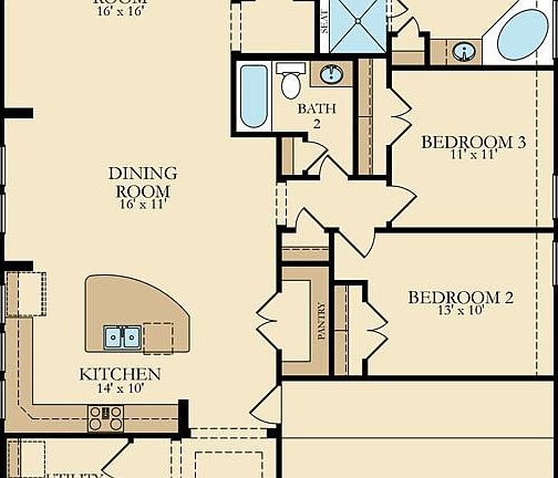 The spacious single story Brandenburg floor plan by Village Builders features a welcoming entry foyer, a study, island kitchen and walk-in pantry, open dining room, generous family room with access to a covered rear patio and the option to add a corner fireplace. The master bedroom with en suite bathroom offers a separate shower and corner tub, dual sinks, private toilet enclosure, and access to a large master closet. The Brandenburg floor plan also offers the option to add an extended covered rear patio.