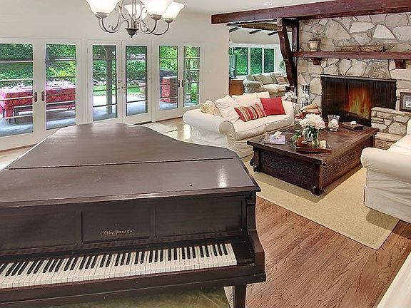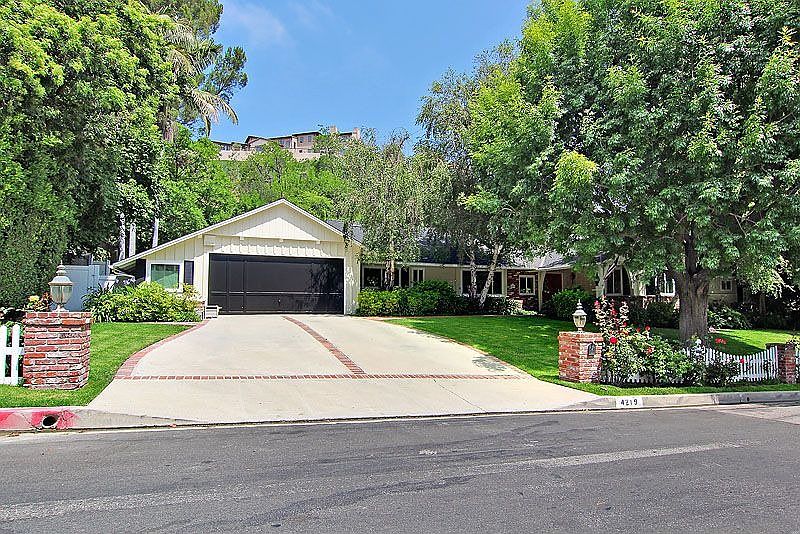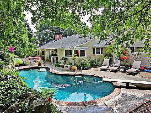 Charming and private ranch home with white picket fence in the prestigious Royal Oaks neighborhood. Located on nearly an acre of land, with mature landscaping, a black bottom pool, covered patio area, and built-in BBQ, this home is ideal for indoor-outdoor living. Double front doors lead into an open concept living area, with sunken living and family rooms, dining room, and eat-in kitchen with wainscoting. Recently upgraded granite countertops and stainless steel appliances in the kitchen, perfect for modern living. Wood and gas burning fireplaces in the living room and family room, with a built-in wet bar in the family room, perfect for entertaining. Spacious master suite with walk-in closet, large bathroom with double sinks and soaker tub. Separate laundry room. Each bedroom with its own bathroom. Double French doors to the back yard, large windows, and recessed lighting make this home feel open and airy.