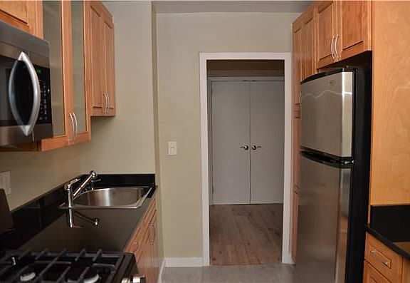 PRICE REDUCED AND TOTALLY RENOVATED! Gorgeous large corner alcove studio, featuring beautiful distressed hardwood plank flooring. Six large windows in the living/dining area with southern and eastern exposures provide amazing natural sunlight. The windowed galley kitchen, unusually spacious for a studio, with black granite counter tops, beautiful new custom cabinetry, new lighting fixture and stainless steel appliances including brand new stove and microwave. The sparkling, fully renovated windowed bathroom also features new lighting. The apartment features an abundance of storage space including three large closets; two of which include ELFA Shelving Custom Closets installed. Freshly painted. Custom Blackout Blinds. Very quiet on a lovely cul-de-sac with a view of a beautiful new green space/park coming soon! This wonderful home is centrally located near all transportation in a full service luxury coop building featuring a 24/7 doorman, concierge service, on-site Property Manager and Super, renovated laundry room, and garage. Central heating/AC is included in the monthly rent. Board approval is required. Please note pets are not allowed in sublets. Guarantors are welcome. Next admissions meeting 4/10; move in available after 4/12.