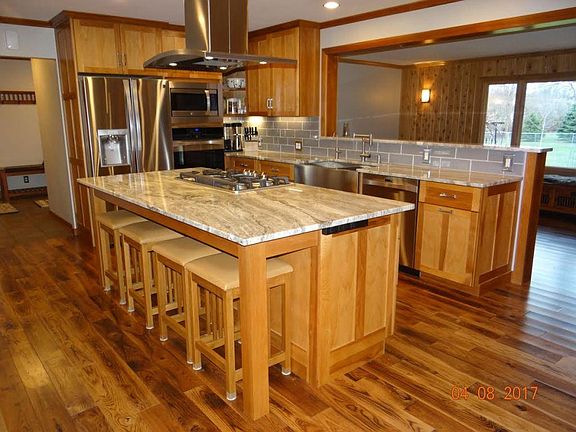 IMMACULATE and METICULOUSLY CARED FOR! There's so much to love in this 3 bedroom, 2 bath home on a large 2 acre lot! This 1955 ranch-style home has been updated & remodeled inside and out! The beautiful gourmet kitchen is the heart of this home with quartzite counter tops, a large center island, high-end stainless steel appliances, custom cabinetry & beautiful solid hickory floors! The warm, inviting family room has solid hickory floors, a gas fireplace, built-in shelving & a flat-screen TV. There is a large living room/dining room combo with a wood burning fireplace, a huge laundry room, mudroom, 3-car attached garage, plus an additional detached garage. The 2 acre lot is perfect for outdoor activities & entertaining with beautiful trees, nice landscaping, a back patio & fire pit.