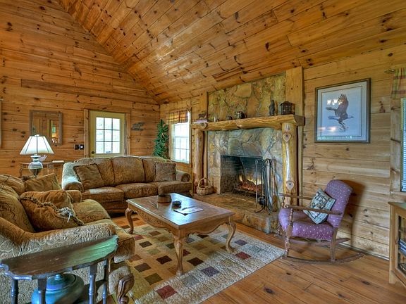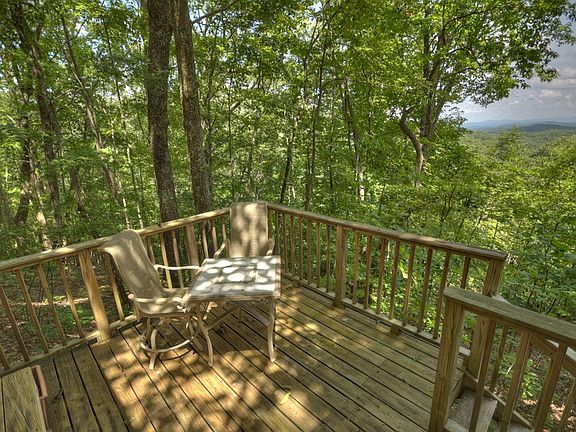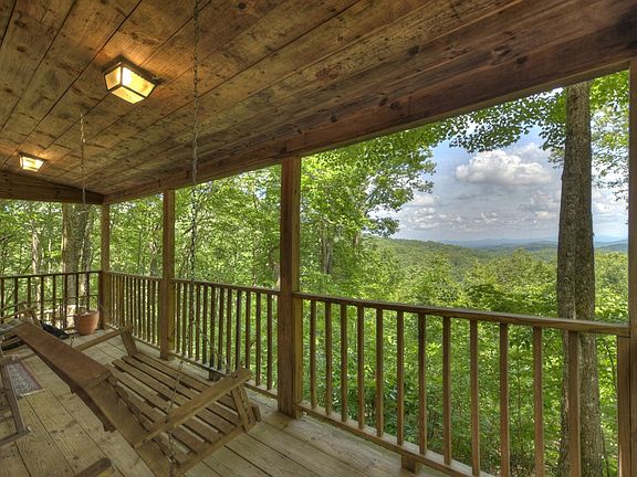 Wow...... Life is "ALL GOOD" Overlooking this Sea of Mountain Peaks. Only 5 mi from Hwy. 515 with an approach along a dramatic stretch of Fightingtown Creek.... inside the National Forest Area of Beautiful Cashes Valley. Open All-Wood Great Rm w/a Romantic Masonry Fireplace....Primitive Stone & Flanked w/Log Columns. Long Window-Bank over Kitchen Sink w/Glass Front Cabinets. Eat In Kitchen. Open Loft Bdrm (storage areas) & (2) Bdrms on Main w/Connecting Full Bath. Upgraded recently with Half Bath. Central HVAC. Open Deck wraps around to a Covered Porch....step down Open Deck & Lower Hot Tub Platform. Amazing Mountain View .... "For Sure" Investment. Fully Furnished. Supportive Community. Strong Bones.