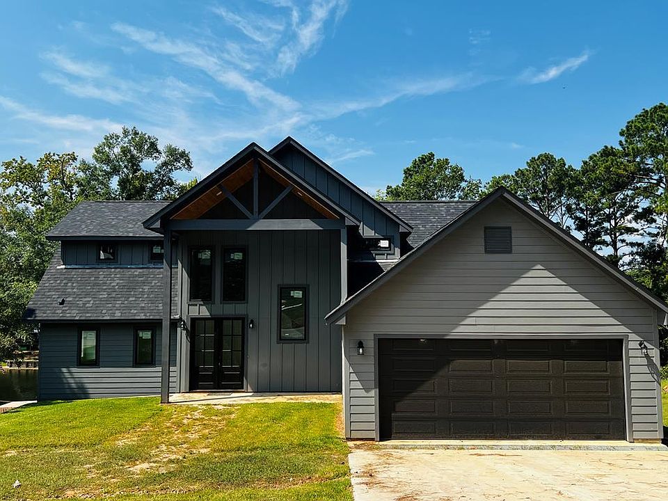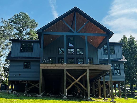 New construction, 95% complete, 2600 sf luxurious lake front home w/grand entrance into 18' ceilings leading to open concept living, dining, kitchen area that includes white limestone fireplace, magnificent 13' island covered w/granite, leather-textured countertops, custom cabinets; a walk-in pantry w/electrical outlets for appliances, water resistant wood floors, 3 bedrooms of which two would support two king size beds OR several bunk beds; 2.5 baths; which master bath exhibits free standing tub & open shower; all rooms have beautiful waterfront views. This house,was built for Hercules himself, Sits on solid pillars attached to concrete columns buried 3' into the ground (per Seller), the large covered porch is wrapped in cedar and there is an unbelievable concrete wall of armor surrounding the front of the home for additional protection, along w/french drains.This magical dream home has an integrated fire alarm, aerobic system 22x35attached garage, Dual a/c 3 ton & 4 ton units.