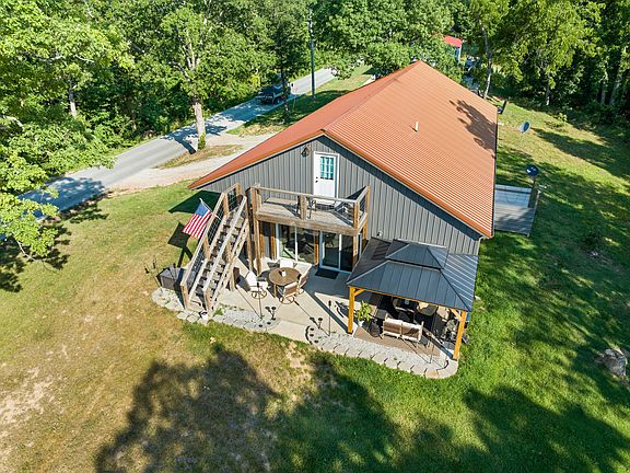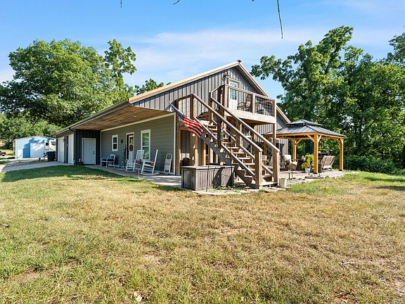 The Lake is Calling! This home offers it all...home, shop, land, & LAKE LIFE!! This home sits in a serene setting on 33 beautiful acres yet it is only 2 miles from Hwy 13. This home is low maintenance and features an extra large 3-car attached garage, metal & LP smart siding, metal roof w/copper finishing, a 30x50 shop, lake views, hiking & ATV trails, and an abundance of wildlife. Located just up the hill from gorgeous Table Rock Lake where there is a public boat ramp or your can purchase a boat slip for additional $$. Entering this home, you will be greeted with the perfect lake home that features 10 ft ceilings with natural pine, concrete floors, newly fully remodeled kitchen with LG appliances, and 3 bedrooms/2 bathrooms (One Bedroom is non-conforming, no closet). Walk upstairs and you will find the perfect guest quarters featuring living area, kitchenette, bathroom, and bedroom. This home was built with the lake in-mind with sliding doors in the primary bedroom and living room that face the lake and a beautiful patio w/gazebo and deck that are perfect for morning coffee or a evening BBQ. There is a good summer view of the lake, but the winter view is AMAZING! Don't wait to view his property! It has it all!Owner is offering a $3000 flooring allowance at closing.