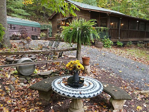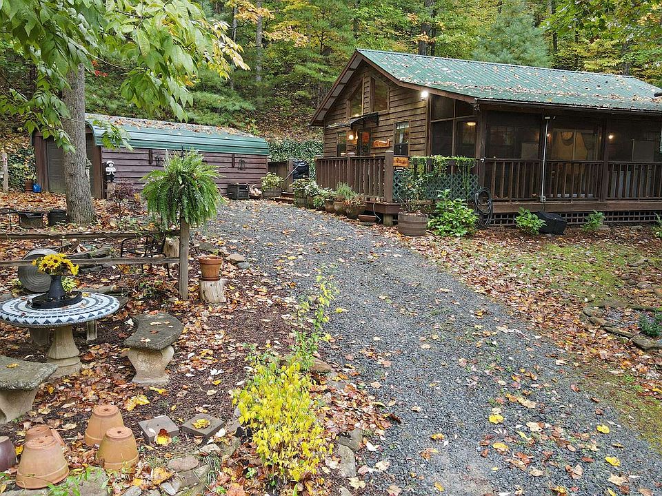 Tranquil 2 bedroom 2 bath wood sided home w/full length screened porch nestled on a lovely landscaped and wooded 1.0 acre lot. Warm knotty pine & drywall w/wood floors and ceilings throughout makes you want to just settle in for a spell. A corner stone stack fireplace w/gas logs in the living room adds another layer of warmth and charm. The screened porch opens onto a deck when you want to enjoy the sun. Take a walk through the enchanted garden, with raised garden beds, arbours, fire pit area and so much more! Then come in and relax in the spa tub of the master. 1 car garage detached a short walk to house plus 12 x 8 shed/workshop and a rubbermaid tool shed. Fiber optic internet available... Come see this gem!