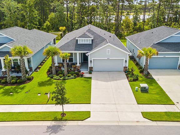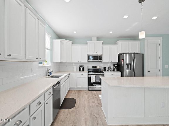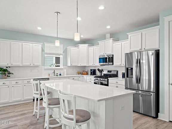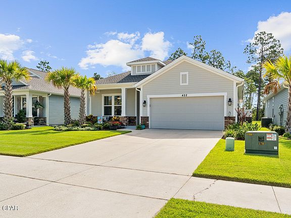Discover the elegance of the Sand Dune Carolina elevation floor plan, offering 1946 sq ft of luxurious living space, 3 bedrooms, 2 full baths, a den/office and a 2-car garage. This meticulously designed home boasts interior features such as 9 and 10-foot ceilings, 10 foot interior doors, complemented by LVP flooring throughout, bathrooms are tiled, remote ceiling fans throughout,. The kitchen is a chef's delight featuring sparkling white granite countertops, the coastal elegance of white shaker cabinetry, gas stove, and custom subway tile backsplash. The heart of the home centers around the spacious kitchen island, perfect for culinary creations and casual dining. French doors lead to the office/den off the kitchen. The spacious and bright great room includes the beautiful kitchen, large dining area and living room. Step from the great room to the 24x28 patio with pavers extending along the entire back of the home and along both sides! Views of both creek and lake where deer can be seen grazing and the occasional bald eagle flying overhead, osprey's nesting, wild herons and egrets fishing . Much of the patio is covered for use rain or shine with plenty of room for dining, lounging and watching TV. Other upgrades include ceiling fans in all rooms, cordless blinds on the windows, a utility sink in the spacious laundry room, and the master shower is customized. All appliances are gas except for the HVAC. The backyard is a delightful extension of the home with the huge pavered patio, beautiful landscaping, gutters, vinyl fencing along the sides, bronze aluminum fencing along the back and a beautiful relaxing view of the Preserve and Gayle's Trails, ideal for walking, jogging and bicycling! This is a premium lot which backs up to the preserve, creek and trail and will not have homes built directly behind it. Built to exceed hurricane code standards, each residence includes 2'x6' exterior walls framing, a hurricane tie-down rod and anchor system, architectural shingles, and superior insulation ratings, ensuring energy efficiency. Located just minutes from the beach and the premier shopping and restaurants of Pier Park, all the new tournament level ball parks, special events, Publix, and located right in the community are HCA Florida Breakfast Point Emergency and the A rated school Breakfast Point Academy- the location can't be beat! Breakfast Point offers a prime location amidst the vibrant coastal lifestyle! The Breakfast Point community is a highly desirable, family and pet friendly neighborhood with many parks scattered throughout with swings, slides and a Pavilion for get togethers and parties. Pier Park, Aaron Bessant Park and Frank Brown Park, a destination for shopping and dining in the Emerald Beaches and a venue for the areas biggest musical events, is just a few miles away and the international airport about 25 minutes away.