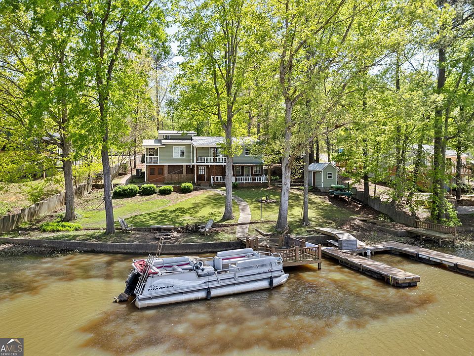 NEW LOWER PRICE, MOTIVATED SELLER!! You will love this waterfront home on Jackson Lake with 1880 SF on a .48 acre deeded lot with 96 FT lake frontage. The main level includes a family room, kitchen and dining areas, two full bathrooms, three bedrooms including one with its own private front entrance and a bonus room with access to the loft. The partial basement has a family room, mini fridge, cabinets and a laundry room, so there's plenty of extra space! The home has a covered front porch and two lakefront balconies, plus a lakefront covered patio. 2024 new metal roof, 2017 HVAC unit, tankless water heater and a wood burning stove. Recently painted exterior and primary indoor space. New custom window shutters outside. There is a short, relatively level walk from the home to the waterfront which features a lakefront fire pit and two docks, one with a pontoon slip. Perennial plants, privacy fence, ample under-house storage and a separate shop with electricity. Served by Spectrum Fiber Optic Network, perfect for working remotely. This lake home is perfect for entertaining, fishing, pontoon rides, kayaking, tubing, swimming and RELAX time with beautiful views, bird watching and sunsets. Great opportunity to enjoy Lake Life! The home is occupied, no trespassing please. Call Charles Sibley at 770-468-3697 to arrange a visit.