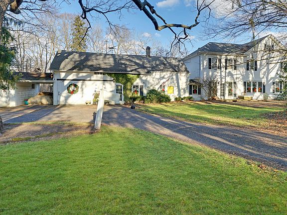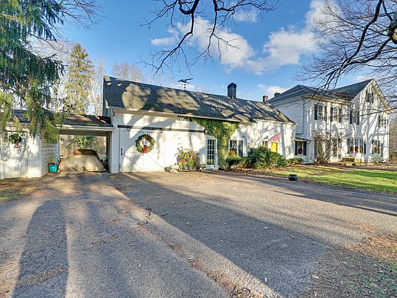 Stunning farmhouse located on 1.25 acres of estate-like setting w/ circular driveway & huge trees, this circa 1807 Center Hall Colonial has been artfully restored & updated with modern amenities for today while enhancing the integrity of the original build. At almost 5,000 sq ft, featuring 5 bedrooms & 2 bathrooms & boasting many original details; including doors/frames, beautiful wide-plank wood floors, 9ft. exposed-wood ceilings, brick fireplaces & wood-burning stove. Original windows & moldings throughout, including an enclosed porch, updated sunroom & stained glass, this home is filled with tons of natural light! Gourmet custom kitchen surrounded by exposed brick & complete w/ wood burning stove, double ovens, indoor BBQ grill & french doors leading out to sunny patio & picturesque
