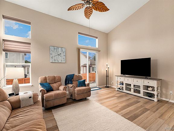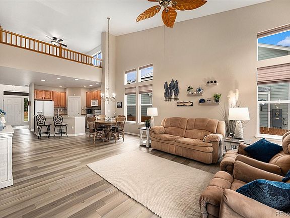 Welcome to your next home, where comfort meets convenience in this spacious two-story gem! Boasting over 3,500 square feet, this beautifully designed residence is perfect for families seeking a blend of modern amenities and cozy charm. As you enter, you'll be greeted by stunning luxury vinyl plank flooring and a soaring 18-foot ceiling in the family room, creating an open and airy atmosphere bathed in natural light from oversized windows. The main floor features a well-appointed kitchen with granite countertops, an island, and ample pantry space, making it a joy for any home chef. Adjacent, the dining area is perfect for family meals or entertaining friends. The main floor primary suite offers a private retreat with vaulted ceilings, a spacious walk-in closet, and a luxurious five-piece bath with an extra-large tub—your personal oasis at home. Upstairs, a versatile loft overlooks the main living space, ideal for a home office, play area, or relaxation zone. Two additional bedrooms share a full bath, providing ample space for everyone. The finished basement is a bonus with a great room that easily converts into two bedrooms, a wet bar, and a full bath featuring heated floors and a jetted tub—perfect for guests or extended family. Outside, the zero-scape landscaping offers low maintenance living, and the expansive patio is perfect for gatherings, with room for a hot tub or above-ground pool. Energy efficiency is a highlight, thanks to a fully paid-off solar panel system with continued service through 2031 and a modern electric geothermal heating and cooling system. Located just steps from Fourteeners Park, complete with open spaces, a gazebo, and a playground, this home offers easy access to shopping, dining, and the Brighton Sports Complex, with I-76 just minutes away for a quick commute. Don’t miss the chance to make this incredible home yours—schedule a visit today! Virtual tour available