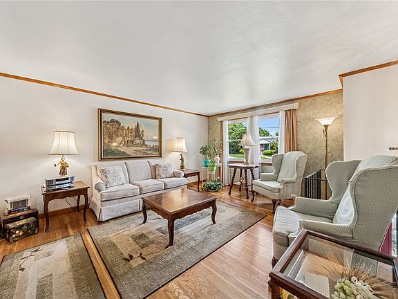 This meticulously maintained home is truly move-in ready! Filled with natural light from abundant windows, it features beautiful original hardwood floors in excellent condition, classic crown molding, and a warm, inviting eat-in kitchen with oak cabinetry and stainless-steel appliances. An updated patio door in the dining room leads to a spacious deck with an awning—perfect for relaxing or entertaining—overlooking a flat, private backyard. The stylish, updated bathroom adds a fresh, modern touch, while the freshly painted interior brings a clean, welcoming feel. The spacious lower level includes a cozy family room and a versatile bonus area ideal for a den, craft room, or gaming space. Recent updates include the roof, hot water tank, and furnace. A concrete driveway and sidewalk add to the home’s curb appeal and function. Comfort, charm, and convenience all come together here—don’t miss your chance to call it home!