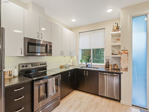 Wonderful end-unit townhouse. Quiet and flooded with light and greenery through every window. Both bedrooms feature en suites, tall ceilings, tile showers. Other highlights include a private patio, stone countertops, efficient heating/AC, and SS appliances. Awesome location just 1-block to Irving Park and a 1+ acre off-leash dog park, 5 blocks to New Seasons and 7 blocks to Eem. Contact your Realtor for a showing today!