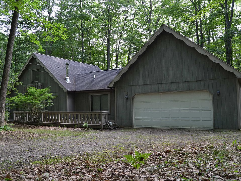 Beautiful chalet with open floor plan, large windows, family room, deck and drywalled garage with plenty of storage.
