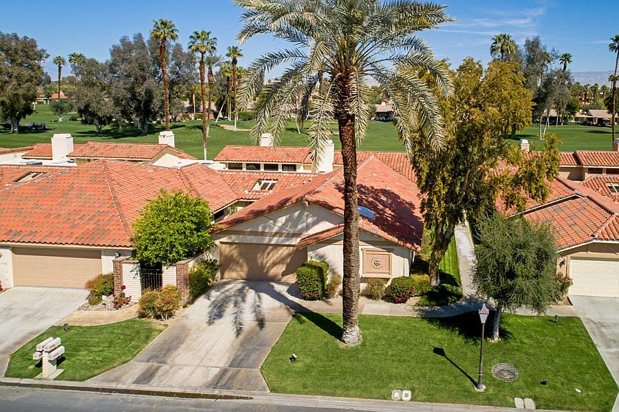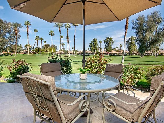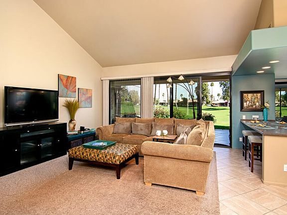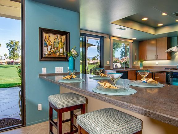 A stunning remodeled 3000 plan located on a double fairway with gorgeous panoramic views. Ideal location for a primary home or vacation getaway. The neutral colors, designer tile flooring, vaulted ceilings and newer windows throughout combine to offer a contemporary open floor plan. Modified from the original with the atrium converted and the addition of 2 lg. skylights illuminating the overall great room. The convertible 3rd bedroom/den is open to the living space but shuttered to close for bedroom or office use. The master and guest are en-suite and have stylish tiled bathrooms and walk-in showers, with a deep soaking tub in the master. This lovely home also features a powder room, and a dedicated laundry. The gourmet kitchen offers a wonderful breakfast bar providing extra counter space and opens to the great room. Custom cabinets, upgraded appliances, newer counter tops, stainless steel hood over the stove all overlooking the patio and golf course. Connect w/the community, meet new people and build lasting relationships. Members are the heart and soul of the club. Specialty dining events, holiday celebrations, family fun days etc. In addition: 14 lighted tennis courts, 20 pickleball and1 bocce ball court, swimming pool and spa, plus a remodeled state of the art fitness center. An affordable opportunity to enjoy the relaxed desert lifestyle. Furnishings and golf cart included. See 'Documents' for upgrades. Canceled due to Buyer's Contingent Sale falling through.