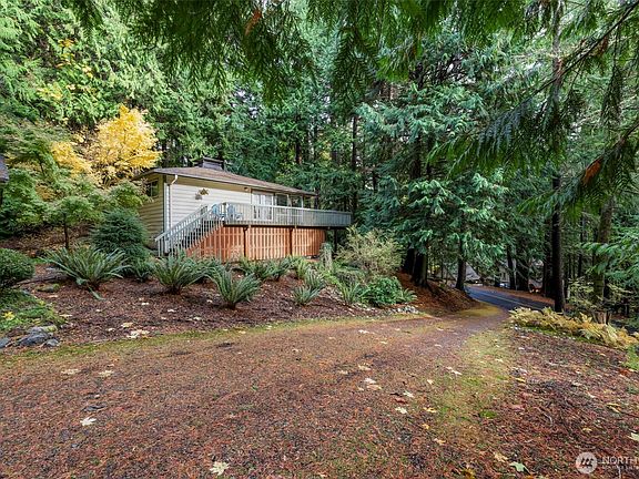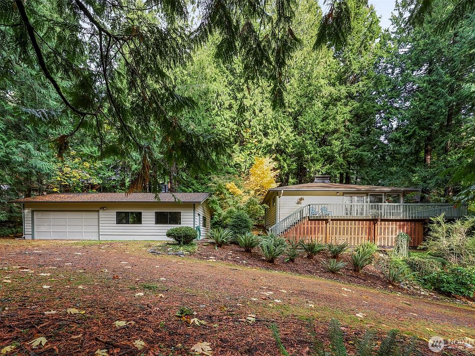 Rare opportunity! Private single level 3BD/1BA sits on a .45A double lot surrounded by evergreens. Inviting wrap-around deck creates a "tree-house" feel & extends living space for year-round enjoyment. Inside, vaulted ceilings, tall windows & French doors fill open living area with natural light. Bright kitchen features new appliances, a dining nook & deck access. Bedrooms look out on greenery; middle one doubles as an office. Economical heat pump, leaf guard gutters & large tall insulated crawl space for storage, access from exterior stairs. The 960 sf detached garage has new roof/gutters, room for 2 cars, plus shop space & framed additional BA - ideal for future studio or guest suite. Extra parking for 5 cars complete this S.V. gem.