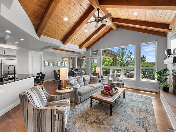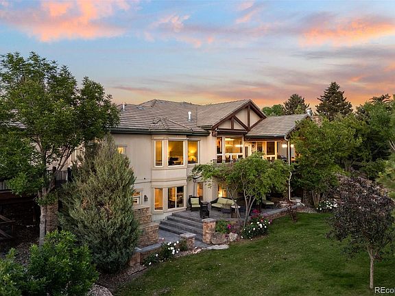 Tucked into one of Castle Pines’ most coveted hidden enclaves, this exquisite custom residence offers a rare blend of refined country living and easy city access. Perfectly positioned on 2.5 private acres in Charter Oaks—an exclusive neighborhood of just 68 homes—this meticulously constructed estate promises tranquility and enduring quality. A grand entrance welcomes you into a striking main floor layout beginning with a richly detailed foyer. The newly remodeled kitchen showcases granite counters, designer lighting, custom cabinetry, and top-tier appliances. An adjacent dining area and inviting breakfast nook flow effortlessly into the great room featuring vaulted wood-beamed ceilings, expansive windows, and a stone fireplace. The main level primary suite is a private retreat, boasting two separate walk-in closets and a newly updated spa bath with marble floors, a freestanding soaking tub, dual vanities, and a double-sided fireplace. An additional conforming bedroom, currently used as an office, a guest suite with en suite bath, a dedicated exercise room, functional laundry room, bonus room | storage room, and a sprawling covered deck with fireplace + dining and lounge areas round out the main level. Downstairs, the walk-out lower level offers a large game room, comfortable family room with a cozy fireplace and built-in media wall, full wet bar, sizeable wine room, home theater, and an additional bedroom with a completely updated en suite bath. Outside, over 50 mature trees and lush landscaping frame two cascading water features, stone stairways, and multi-tiered patios and decks. Additional features include a concrete tile roof, stucco exterior, and over $300,000 in thoughtful updates in the past 18 months. Enjoy the bucolic lifestyle of a mountain retreat with all the convenience of city living—just 20–25 minutes to downtown Denver, 45 minutes to DIA or Colorado Springs, and within minutes of shopping, dining, and highway access.