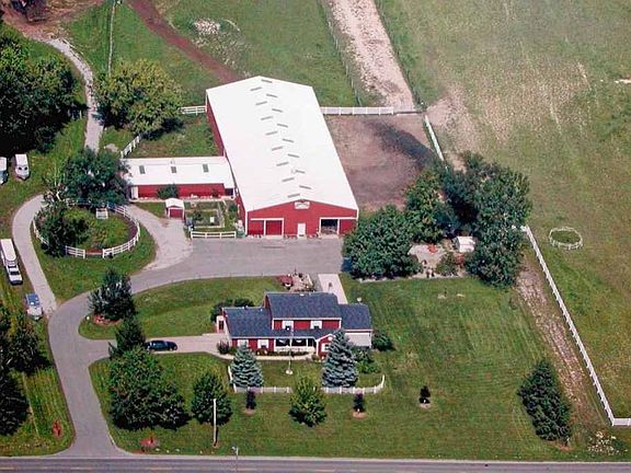 Country living on 10.677 acres with city conveniences. Two story on walk-out basement, built by classic builder, Terry Ternet, boasting 6 inch walls, triple pane Andersen windows and vinyl clad aluminum siding. Kitchen remodeled in 2005, featuring natural cherry cabinets, Heartland country style smooth top 5 burner range, SS dishwasher and refrigerator, refinished wood floors. New granite counters 2016. Living room with new carpet, Den or Formal dining room w/wet bar, leaded glass window. Main level bath has ceramic tiled steam shower and towel warmer. Room addition, 23x15, can be family room, office or party room; slider to brick patio w/motorized awning. Upstairs features all new carpet, En Suite with generous bath, dual sinks, ceramic tiled shower and a huge walk-in closet; 2 add'l BR's & bath. Walk-out lower level features large rec room with masonry brick fireplace, big patio and 3rd car garage. Horse barn is 148 x 60 with a 99 x 60 indoor riding arena. Small barn 30 x 60. Horse stalls: 18, barn has 400 amp service, office, secure tack room, classroom and arena viewing room. Property features 2 fenced pastures/riding area. Pond at back of property. Heat is heat pump w/gas forced air backup. Roof shingles new Nov. 2014, new grinder pump for sewer system May 2016.