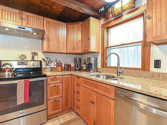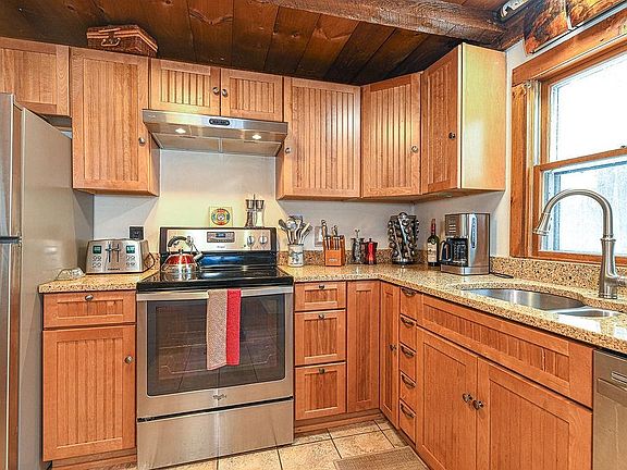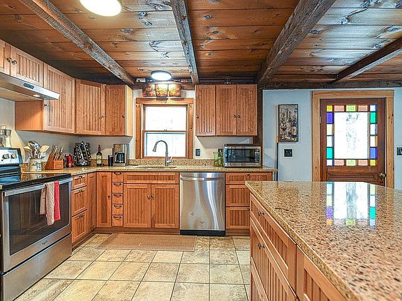This charming ranch-style home is the epitome of country living. Nestled on a private 2-acre wooded lot and set back from the road, this property offers a serene retreat surrounded by nature while still being conveniently located. Just 30 minutes to Concord and 90 minutes to Boston, you'll enjoy easy access to nearby lakes, mountains, and state parks. Step inside and be greeted by an inviting open-concept design that seamlessly blends rustic charm with modern updates. The updated kitchen and baths complement the exposed wood beams, wood ceilings, and walls, creating a warm and timeless ambiance. Beautiful hardwood floors flow throughout, while built-in wood cabinets add both style and functionality. Stay cozy during the colder months with the wood stove and classic brick hearth, adding character and efficiency to the living space. The durable metal roof offers peace of mind for years to come. Outside, you'll find two sheds for storage and plenty of room to explore and enjoy the great outdoors. Don’t miss this opportunity to experience the perfect blend of privacy, comfort, and proximity to recreational activities. Being sold furnished, as-is.