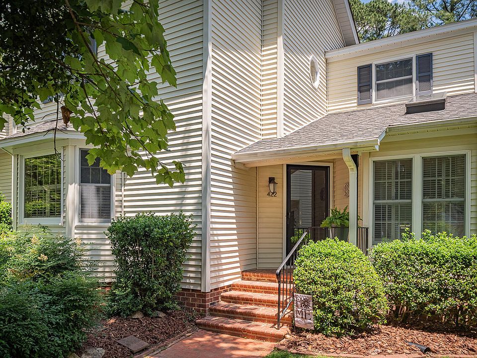 Welcome Home! Enjoy the Fearrington lifestyle in this roomy 3-bedroom end-unit townhome (most popular floorplan) FRESHLY PAINTED and ready to go! ALL APPLIANCES INCLUDED*Pretty primary bathroom updated with DOUBLE SHOWER*Bonus heated/cooled sunroom extends living space PLUS enjoy watching nature from your brick PATIO overlooking rear garden. HEY, LOOK - NO POPCORN! (ceilings), all smooth and freshly painted. Soaring ceiling in huge living room FLOODED WITH NATURAL LIGHT* RARE WOOD-BURNING FIREPLACE*Tons of storage*Bonus 2nd-floor loft to be office/yoga space/grandkids' campout PLUS additional bonus space off guest bedroom for crafts, your book collection or just STUFF. Mailing address is 422 Fearrington Post. Schedule your showing today! HOA owns single car garages. INVESTORS: rental cap in place, not currently near limit.
