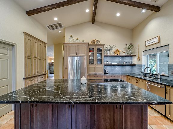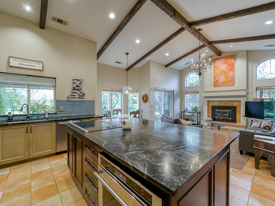 This 4 bedroom 2.5 bath home has undergone a full remodel saving you thousands of dollars and time. From the tall OPEN BEAM ceiling in the living room to the Kitchen with CUSTOM cabinetry with built ins, soft close drawers, and 7.5' x 5' Soapstone Island with high end induction cooktop. Floating shelving with under-mount recessed lighting. Windows everywhere to enjoy your .41 acre lot. Master bedroom has an on-suite bath with double sided fireplace to enjoy from your bedroom or your freestanding soaking tub. The walk in shower massages your feet with the natural stone base. Enjoy the spa like tile from floor to ceiling. The mature trees offer a shaded canopy for the summer days and built in waterfall amongst the landscaping, Even Room for a POOL. NEWER Heating and A/C units, A MUST SEE